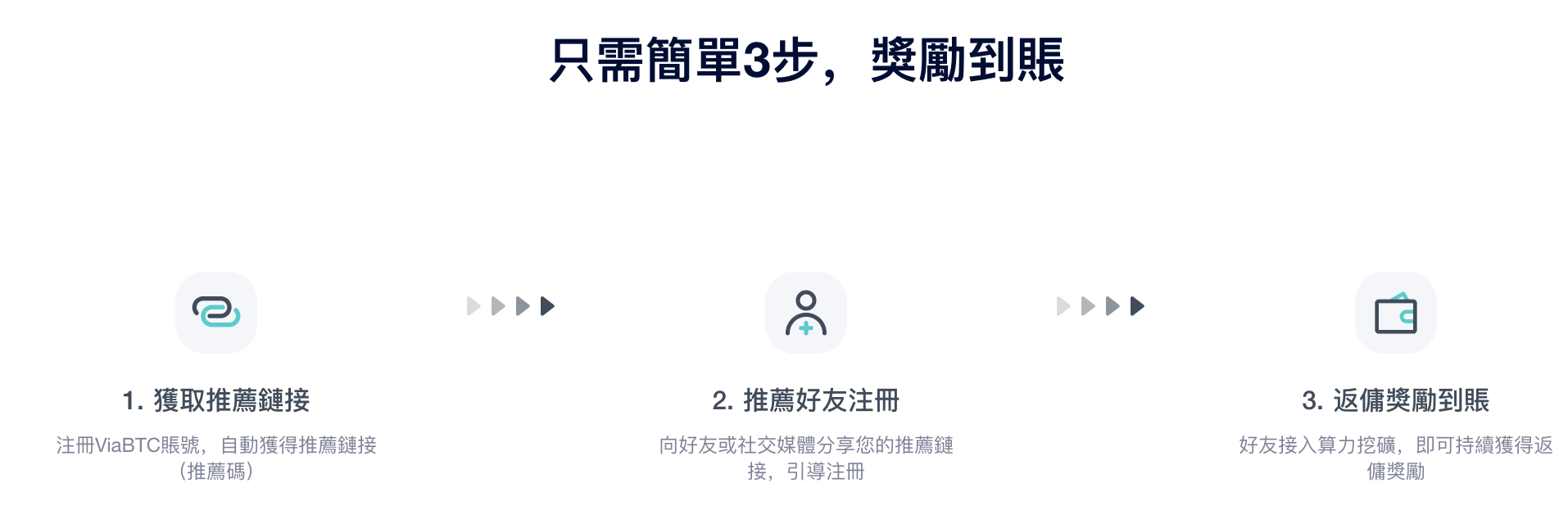 為了返利、讓利給老礦工,同時希望有更多的新礦工接入ViaBTC微比特礦池,於是決定對推薦返傭功能進行重構升級。註冊並登錄ViaBTC後,從Web端或App端進入「推薦返傭」介面,找到您的專屬推薦鏈接(或推薦碼)並分享,當新用戶通過您的推薦鏈接(或推薦碼)成功註冊ViaBTC帳號,即可獲得一張5折30天的挖礦費率優惠券,成功接入算力挖礦後,您將獲得最高20%的返傭獎勵,該功能已於2022年1月19號(HKT)上線。