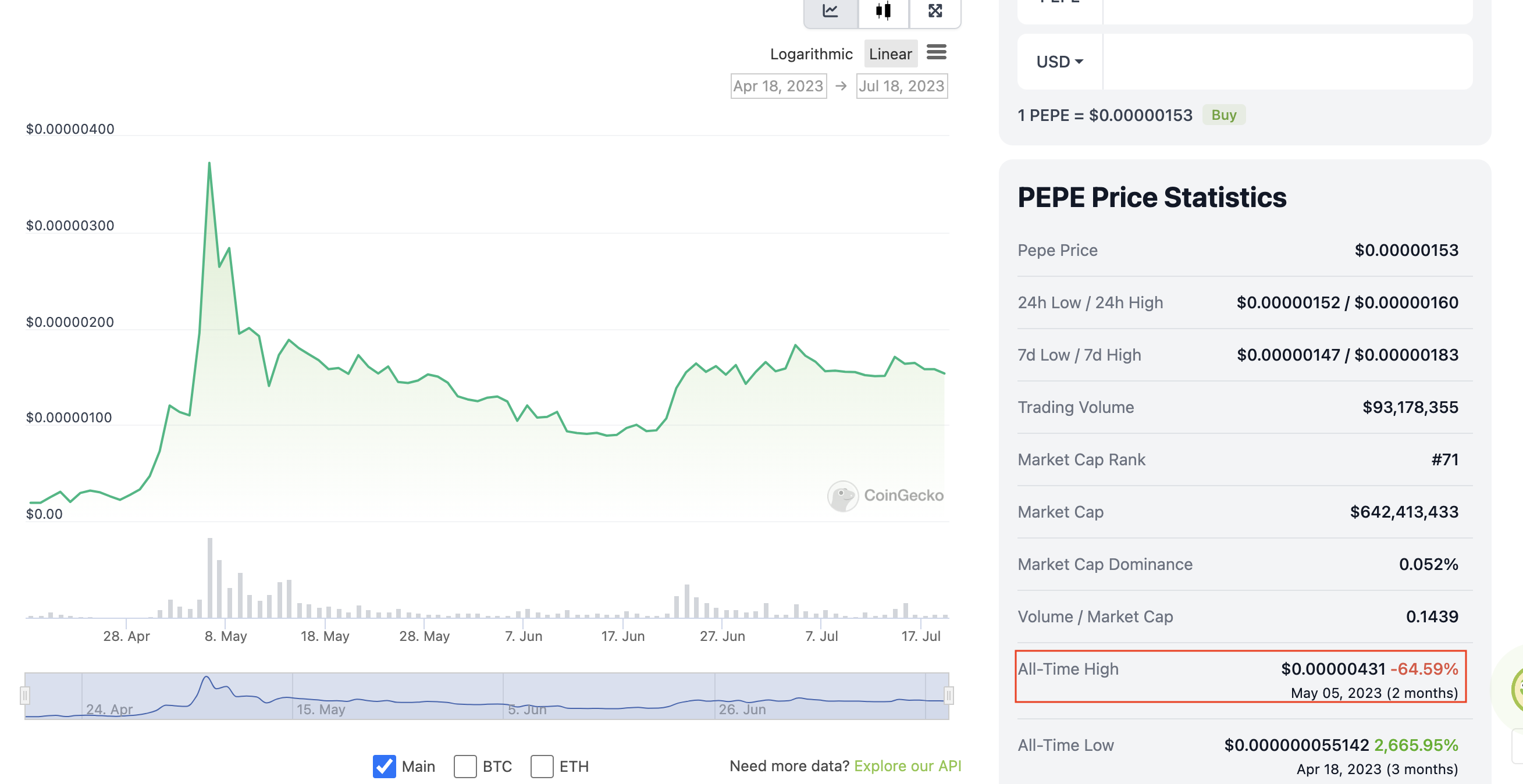 PEPE现报价$0.00000153,距离5月5日的历史高点$0.00000431,跌幅达64.59%。