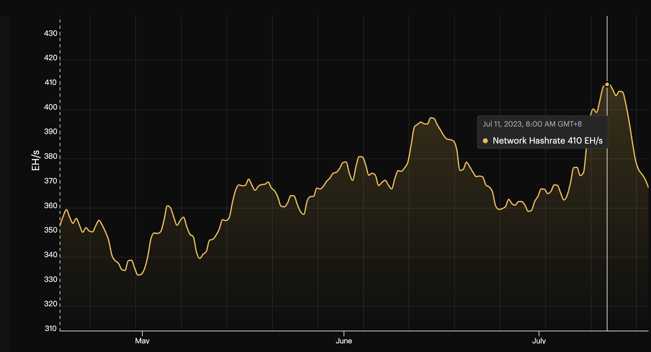 然而,这似乎并没有影响到比特币矿工的挖矿热情。据数据显示,自今年5月以来,比特币网络算力虽然波动较大,但总体呈曲折增长趋势。即使在BRC-20热度降温的情况下,7月份里也已经连续多日突破400 EH/s关口。现在看来,比特币网络算力的增长与明年的另一个重大叙事——比特币减半,有着很大的联系。