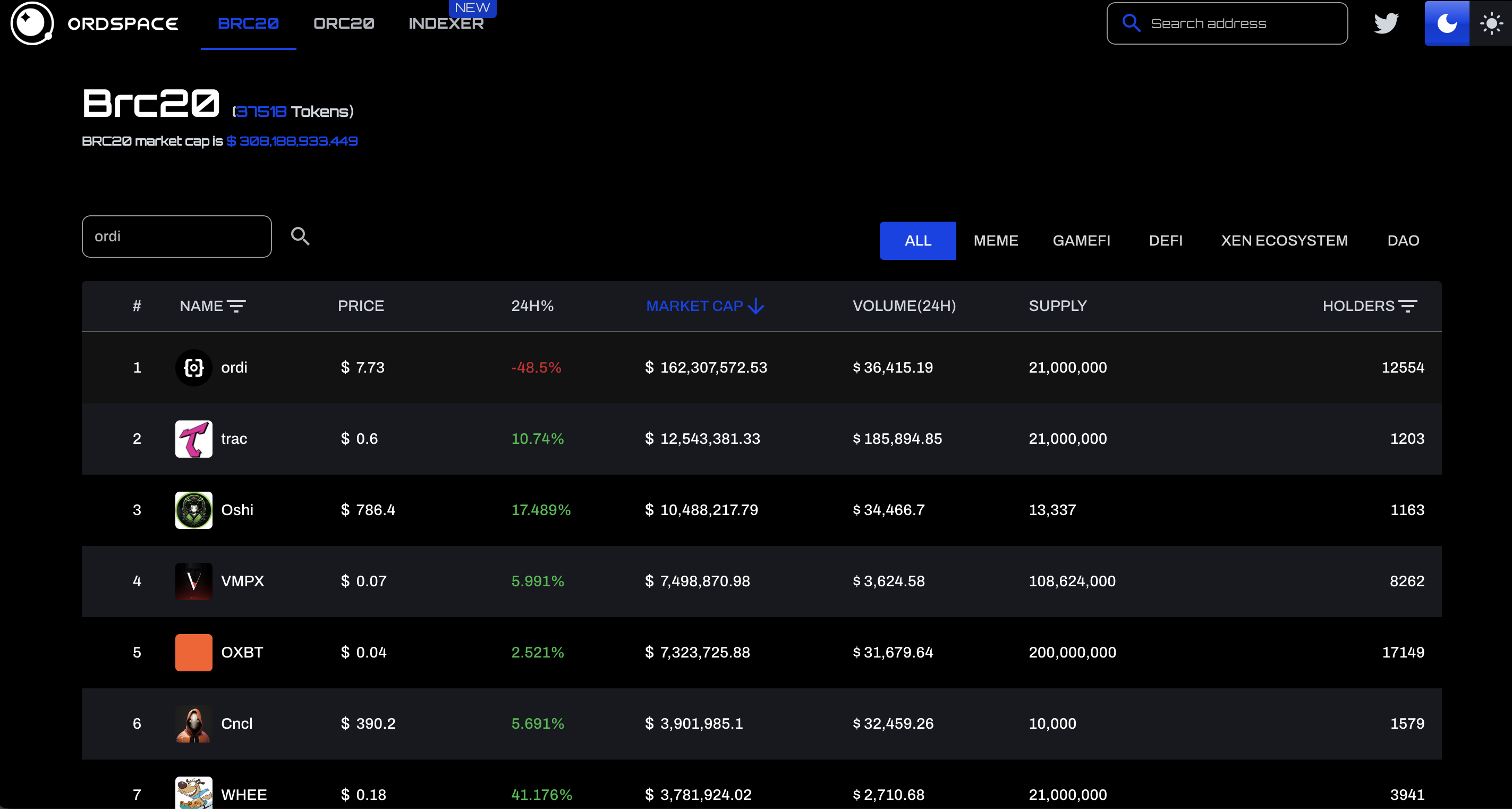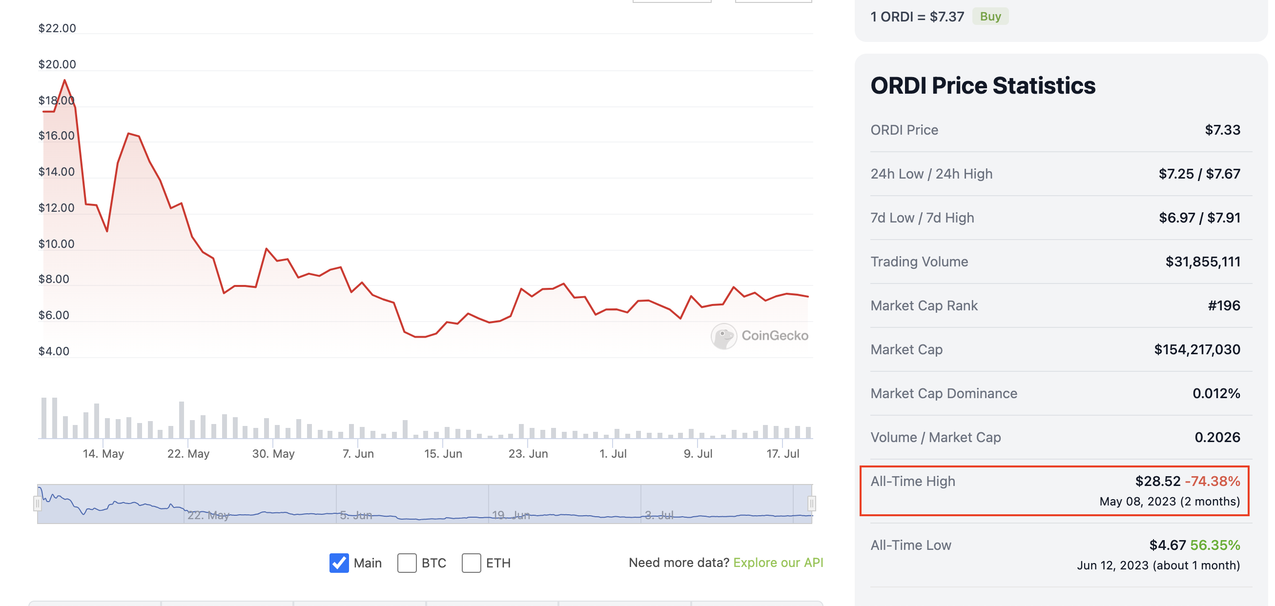 ORDI现报价$7.37,距离5月8日的历史高点$28.52,跌幅达74.38%;