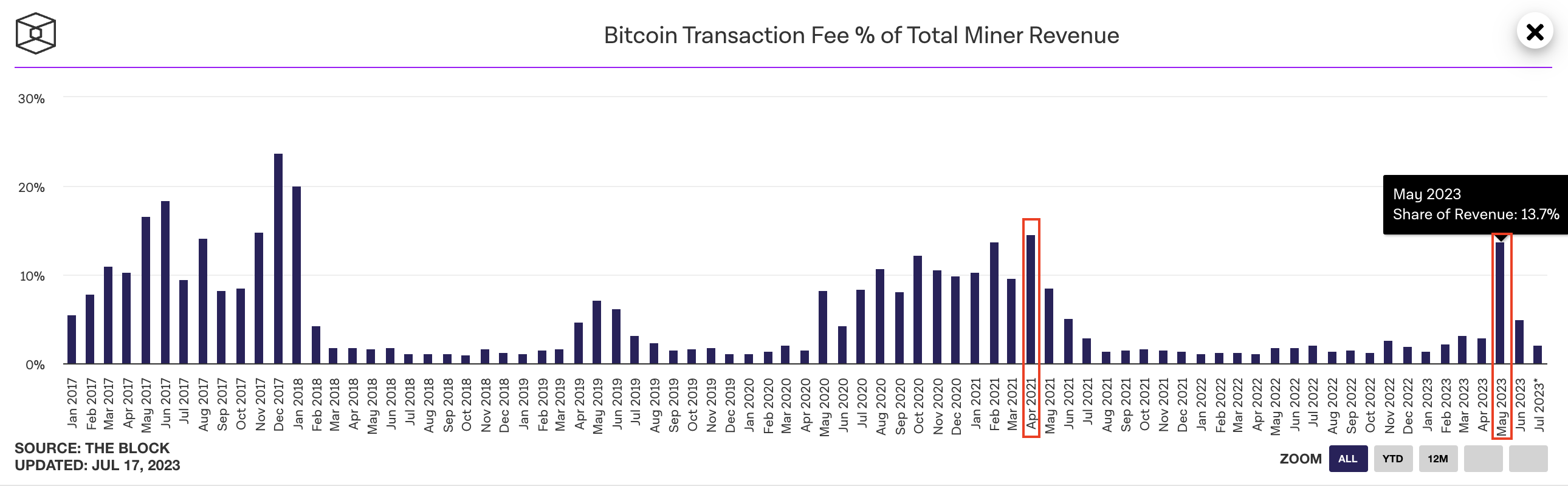 BRC-20代币的爆火让比特币矿工直接受益,他们的挖矿收入也因此大幅增长。比特币矿工在4月8日的每日交易手续费收入约为21.8 BTC,而在5月8日则达到了635.3 BTC,一个月内增长了29倍。根据TheBlock平台的数据,5月份比特币矿工总收入约为9.2亿美元,其中交易手续费收入约为1.26亿美元,占总收入的13.7%。这是自2021年4月以来,交易手续费收入再次占比超过10%的情况。