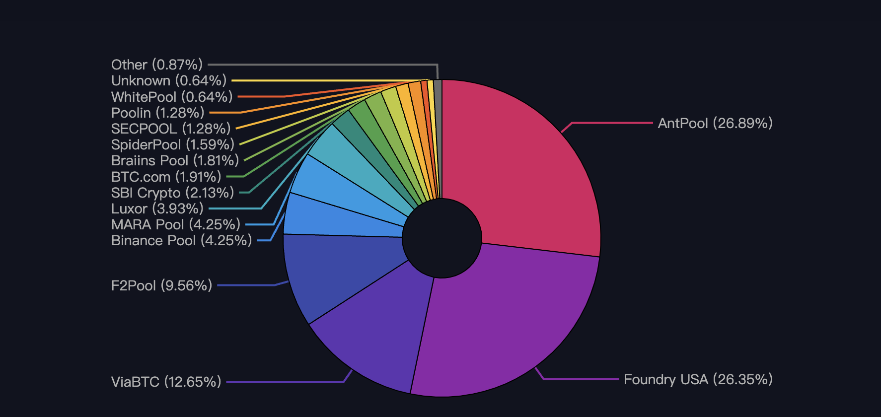 過去7天各家礦池的比特幣平均算力份額占比情況,來源於Mempool