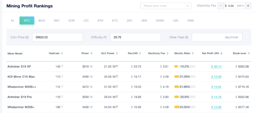 其次,是礦機的選擇。不同的礦幣,所選用礦機不同,收益和回本週期也不同。以BTC為例,目前主流的礦機涵蓋了Antminer S19 XP(Hashrate 140T)、KOI Miner C16 Max(Hashrate 113T)、Whatsminer M30S++(Hashrate 112T)、Antminer S19 Pro(Hashrate 110T)、Whatsminer M30S+(Hashrate 100T)等等型號的礦機。