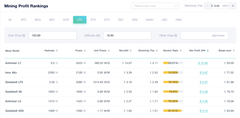 實際上,無論是新進礦工還是老礦工,在ViaBTC官網(https://www.viabtc.net/)中的【工具】一欄裏找到【礦機收益排行榜】,都能夠查閱到當前各主流幣種對應的礦機型號、算力大小、單位功耗、日產出、關機幣價等礦工普遍關注的資訊。